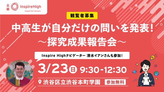 「世界とつながる探究的な学びを手軽に教室で」をコンセプトとしたEdTech教材を提供する、株式会社Inspire High(本社:東京都千代田区、代表:杉浦太一)は、中高生の探究成果報告会を3/23(日)に対面開催します。