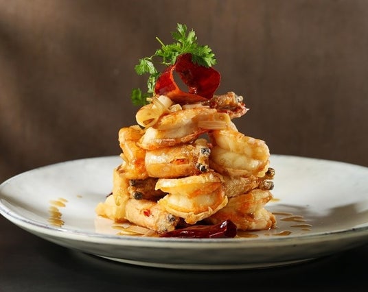 殻付き海老を高温でさっと炒め、外は香ばしく中はプリッとした食感に仕上げた一品。スパイスを効かせた軽やかな辛みと、海老の甘みのバランスが絶妙な一皿です。
