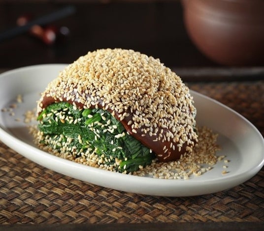 幼少期に母親が作ってくれた思い出の味を再現した一皿です。当時、彼の母親はセロリの葉に北京伝統の胡麻ソース、黒酢、胡麻油、各種スパイスを加えて和えたものを作っていました。家族が楽しみにする料理として愛されていたこのレシピを、2003年に進化させオリジナルのメニューとして提供を開始しました。今回は、より風味豊かなほうれん草を使用しています。特製の胡麻ペーストで和え、独自に調合したマスタードオイルを加え、仕上げに香ばしい煎り胡麻をたっぷりと振りかけた逸品です。奥深い味わいを堪能いただけます。