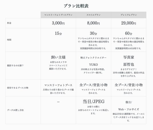 気軽に楽しめる「マンスリーフォトブースプラン」、おしゃれで映える写真を撮影する「スマイルプラン」、そしてプロ写真家 原哲也が手掛ける「プレミアムプラン」など、飼い主様のニーズに合わせたプランをご用意。