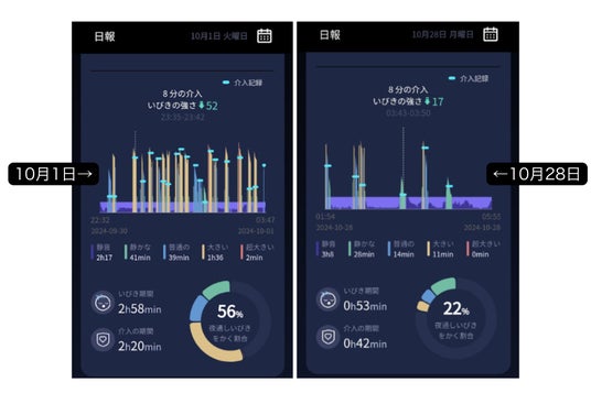 ・いびきの大きさを5段階に分けて計測し、いびき防止の効果を数値やグラフで実感できます。過去の睡眠状況データを閲覧することにより、睡眠状態の変化もわかります。
