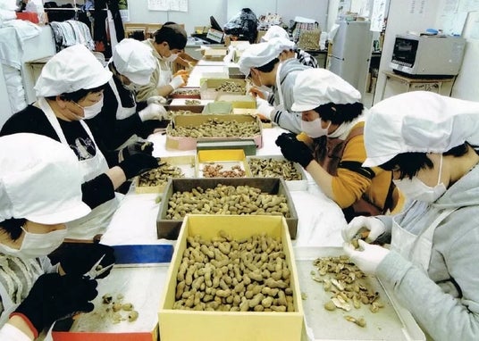 障がい者施設での手剥きの様子。地域の障がい者施設約15ヶ所と農福連携をしています。