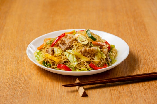 たっぷりの野菜とお肉をフライパンで4分間蒸し焼きにし、カレーパウダーを絡めるだけで簡単に美味しい焼ビーフンが出来上がります。カレーの風味で野菜がたっぷり食べられます。