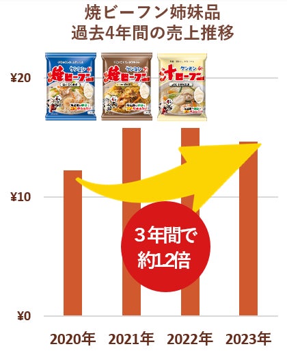 「ケンミン焼ビーフン鶏だし醤油」はすべてのユーザー層で購入頻度が増加しています。それに伴い姉妹品の売り上げは、3年間で1.2倍に増えています。