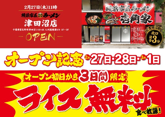 株式会社ガーデン(本社:東京都新宿区 代表取締役社長:川島賢 以下「当社」)が運営する「壱角家」は、「壱角家 津田沼店」を2025年2月27日(木)にオープンいたします。「壱角家 津田沼店」ではオープンを記念して、2025年2月27日(木)、2月28日(金)、3月1日(土)の3日間限定で「ライス」を食べ放題無料で提供いたします。