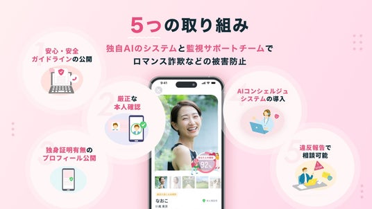 「ラス恋」では、「生涯寄り添い合うお相手が見つかる」出会いの場として安心してサービスをご利用いただくため、「安心・安全ガイドライン」の公開をはじめとした5つの取組みを実施。公的書類での身元確認や独身証明書の提出推奨に加え、独自のAIシステム+監視サポートチームによって365日24時間の監視体制で違反報告対応を行うなど、ロマンス詐欺等の本来の目的とは異なる利用による被害防止に注力しています。
