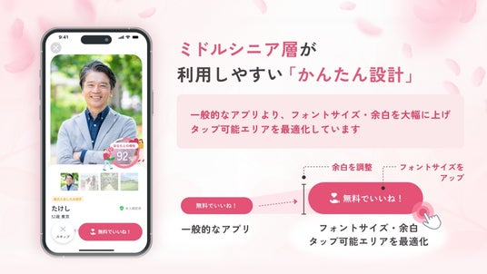 40歳以上を対象とする「ラス恋」は、予てよりアプリ利用におけるミドルシニア世代特有の課題解決に取り組んできました。ボタンや文字サイズなどの操作性向上はもちろん、趣味や価値観を選択するだけで魅力的な自己紹介文を提案する機能の搭載など、はじめてアプリを使用される方にも使いやすい設計を重視しております。