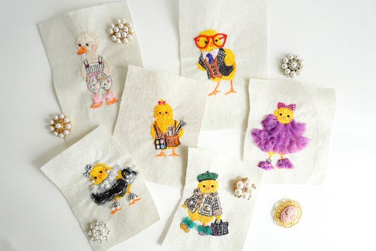 繊細なステッチが織りなすヒヨコや衣装のデザインの原型は手刺繍です。