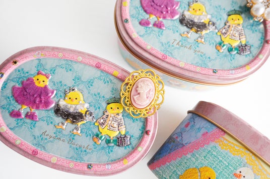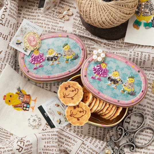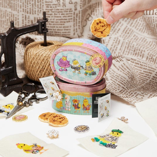 "刺繍" のヒヨコが主役のお菓子缶、"ピヨピヨ煎餅"とカメオやパール風デザインのボタンマグネット1粒入り『ピヨコレ缶』が新登場。世界に一つだけの特別な缶 "名入れサービス" がスタート!