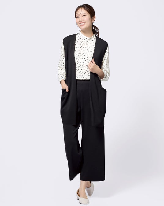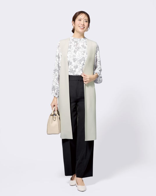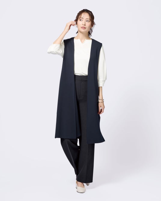 ジレ1枚で、こなれ感のあるコーディネートへ人気のソフトストレッチ素材を使ったジレはカーディガン感覚で着ることができて、パンツとの相性が抜群。1枚羽織るだけでこなれ感のあるコーディネートが完成します。