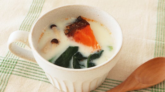 「さけ 焼き蔵みそ漬」を使用した豆乳スープ