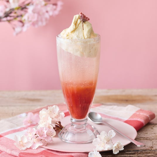 ほんのりさくらが香るストロベリーソーダにミルクバニラアイスを合わせました。