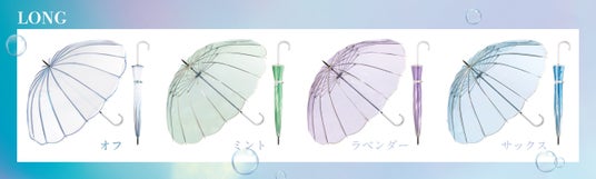 オフ、ミント、ラベンダー、サックスの4色展開の長傘は16本骨ならではの美しいシルエットが特徴。水面の輝きを連想させるきらきらとしたパイピング、光沢のある手元やパールボタンの留め具など個性が光る1本です。