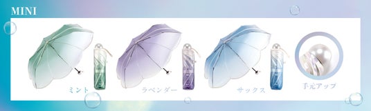 一方、ミント、ラベンダー、サックスの半透明の生地を使用した3色の折りたたみ傘は、中央から先端に向かってグラデーションになっており、傘を広げると深海を泳ぐマーメイドになった気分。パールのような丸い手元は雨の日の気分を高めてくれるポイントに。
