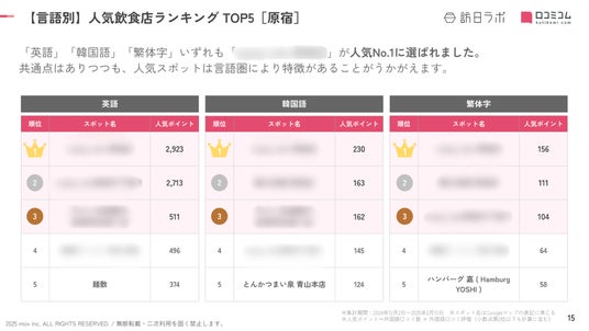 業界最大級のインバウンドビジネスメディア「訪日ラボ」及び 店舗向け集客一元化プラットフォーム「口コミコム」を運営する株式会社mov(代表取締役:渡邊 誠、本社:東京都渋谷区、以下mov)は、原宿エリアの飲食店に寄せられた最新の口コミデータから、独自の『インバウンド人気観光地ランキング』を発表しました。
