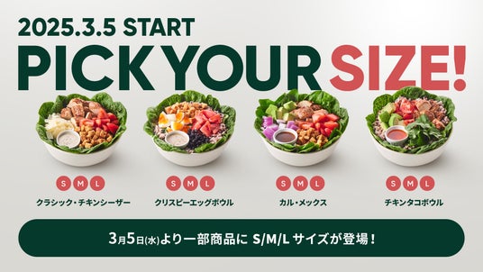 「サラダはおいしいけれど、もう少し量が少ない方がうれしい」「お腹いっぱい食べたいときもある」というお客様の声を受け、3月5日(水)より人気4商品でSサイズ・Lサイズのトライアル販売を行います。これまでは1サイズのみでしたが、この取り組みにより選択肢が増え、ライフスタイルや食事シーンに合わせて「サイズ」もカスタマイズできるようになります。なお、これまで販売していたサイズは「Mサイズ」として販売を継続します。