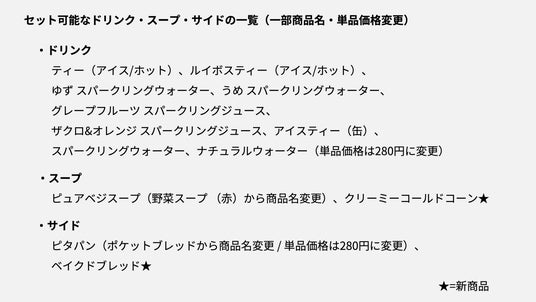セット販売開始に合わせて、とうもろこしの甘みとコクを存分に味わえる「クリーミーコールドコーン」や、全粒粉の香ばしさを引き出した「ベイクドブレッド」といった新しいスープやサイドも登場。ドリンクやスープ、サイドなど「サラダ以外のメニュー」も今後さらに拡充していく予定です。