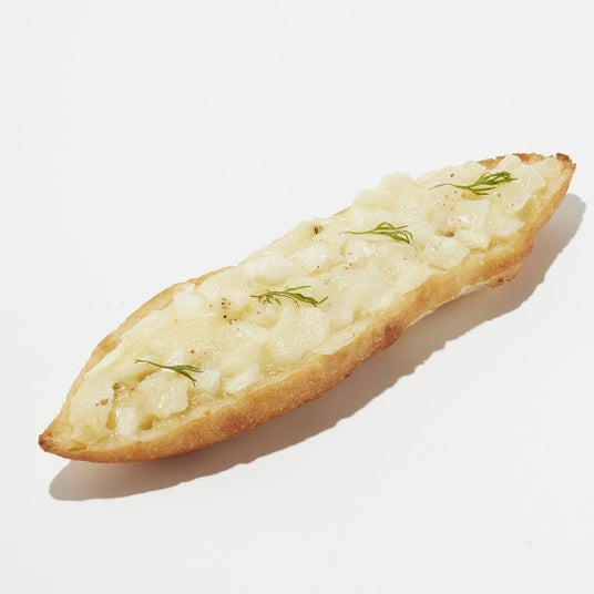 パルメザンチーズの塩気と新玉ねぎの甘みがマッチした旬のタルティーヌ。