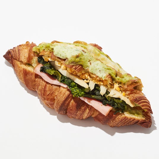 菜の花のピューレ入り特製ベシャメルソースと菜の花、筍、ロースハム、ゆで卵をサンドしました。