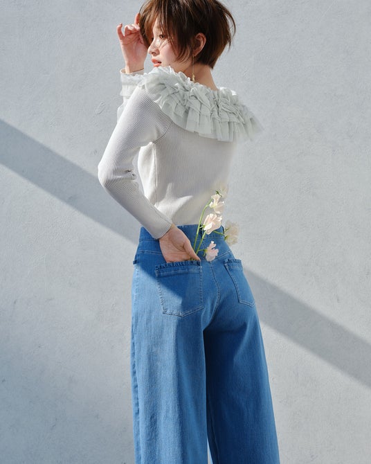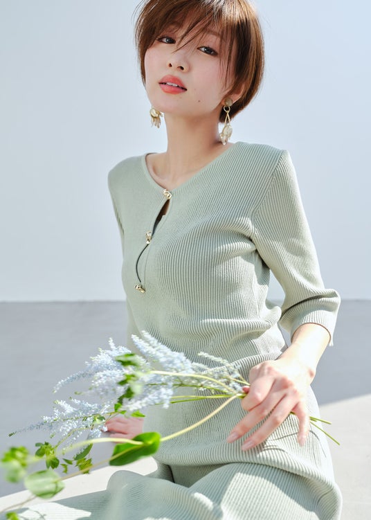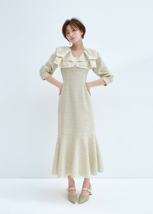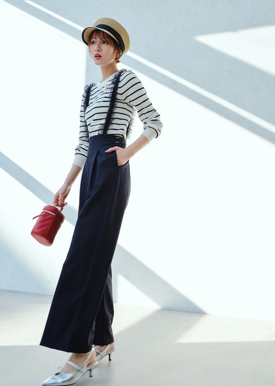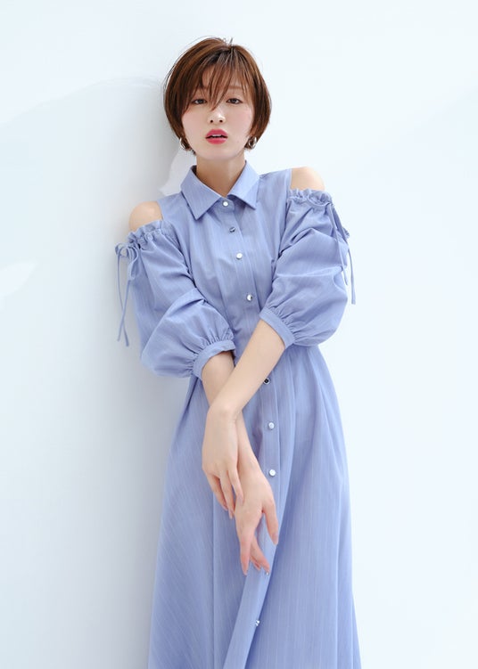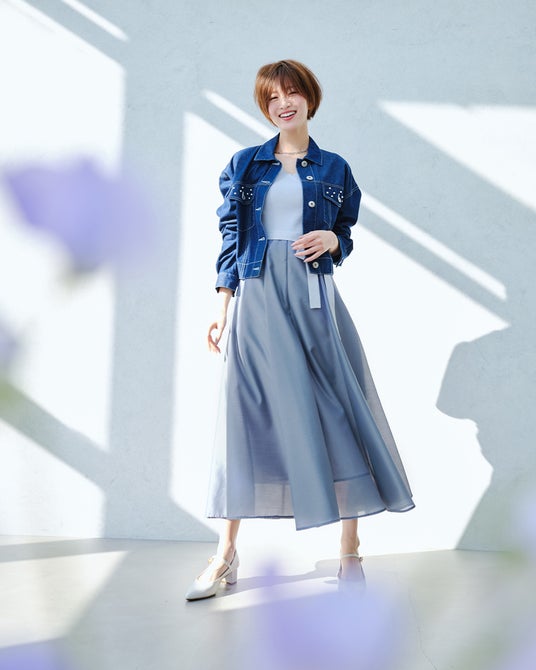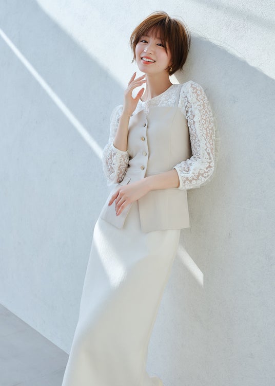 軽やかでやわらかなマテリアル、ふわっと立体感のあるディテールで大人の愛らしさを表現した新作コレクションを、フェミニンさの中に爽やかな雰囲気も感じられる抜け感のあるスタイリングで岡崎紗絵さんが着こなしています。