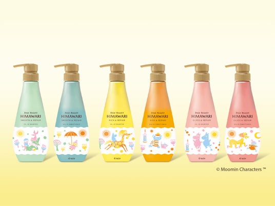 髪ゆがみの原因を髪の内部と外側からトータルケアする「ディアボーテHIMAWARI」は、ブランド共通特長成分「プレミアムヒマワリオイルEX」配合で、髪の内部にうるおいをあたえ、髪の外側のキューティクルのはがれをコートします。広がり抑制処方の「リッチ&リペア」、うるおい&ツヤUP処方の「グロス&リペア」、指通りなめらか処方の「スムース&リペア」と、髪悩みと仕上がりで選べる3ラインが「ムーミン」キャラクターで彩られ、毎日のバスルームが華やかになります。