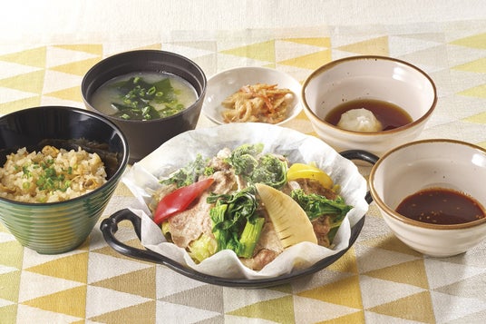 和風だしで、菜の花・たけのこなどの春野菜と一緒に蒸した鹿児島県産黒豚と、旨味たっぷりのあさりごはんのセット。ゆずポン酢と甘辛な唐辛子味噌だれの2種類でどうぞ。