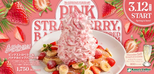 株式会社KONA’S(本社:東京都渋谷区、代表取締役社長:阿部 和剛)が展開する、食の感動体験を追求し「いちばん近いハワイ」をコンセプトに掲げるハワイアン カフェ・レストラン「コナズ珈琲」は、春の限定メニューとして「ピンクストロベリー&バナナホイップパンケーキ」を2025年3月12日(水)から4月20日(日)まで、全国のコナズ珈琲にて販売いたします。