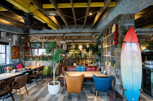 カラフルなハワイアン雑貨やサーフボードが飾られ、遊び心のあるソファやテーブルなどのこだわりのインテリアが、まるで、ハワイのローカルのリビングにいるような雰囲気を演出します。ゆったりとくつろげる空間で、日本にいながらハワイ気分を味わえます。
