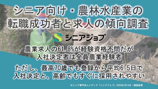 シニア転職支援の(株)シニアジョブ(本社:東京都新宿区/代表取締役 中島康恵/以下、シニアジョブ)は2月26日、サービス提供するシニア専門求人メディア「シニアジョブ」における農林水産業の求人と入社決定者についての調査結果として、最高で70歳のシニアが登録から平均6.5日で入社決定に至っており、高い年齢でも短期間での採用が可能であるものの、入社決定者全員が経験者であったことから、経験不問の求人であっても経験者が求められている可能性があることを発表しました。
