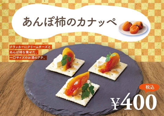 今回、郡山市の人気居酒屋「しのや」とコラボし、「あんぽ柿の白和え」「麓山高原豚のステーキあんぽ柿・味噌醤油のソース添え」「あんぽ柿のカナッペ」「あんぽ柿のチーズムースケーキ」4種類のメニューを考案しました。お酒のあてに、ごはんのお供に、食後のデザートにもピッタリ!