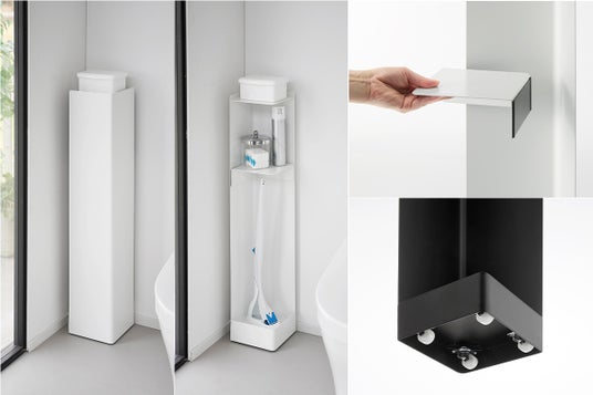 マグネット付きの棚板は高さを自由に変えられ、長いトイレブラシも収納可能。
