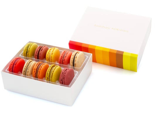スペイン産アーモンドを使用しサクッと軽やかな食感に焼き上げたマカロン生地に、素材の風味を活かしたなめらかなクリームをサンドしたアオキのスペシャリテ。カラフルなマカロンをホワイトデー時期限定のキュートな箱に詰め合わせました。