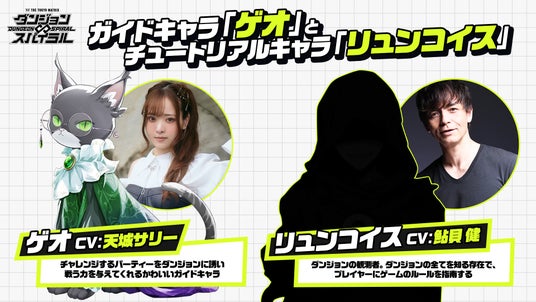 パーティーをダンジョンへ誘うガイドキャラ「ゲオ」と、ゲームのチュートリアルやルール説明を行う「リュンコイス」が、あなたの冒険に彩りを添えます。ゲオ役は天城サリーさん、リュンコイス役は鮎貝健さんが、日本語・英語で熱演。