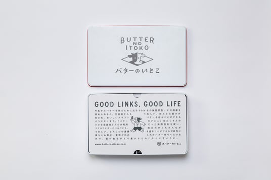 蓋を開けるとその裏は縁起のいい赤色に、バターのいとこキャラクターの”いとこちゃん”がお客様に福をお届けするイメージで描き下ろされた可愛らしいオリジナルイラスト入り。