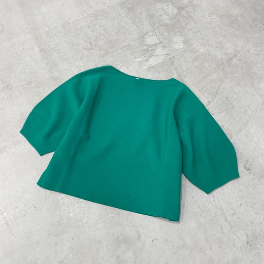 スッキリとしたボートネックと、立体的なパフスリーブのデザインが特徴。肘まである少し長めな半袖デザインのため、肌の露出を抑えつつ、上品に着こなせるアイテム。