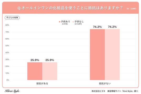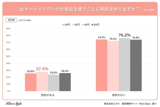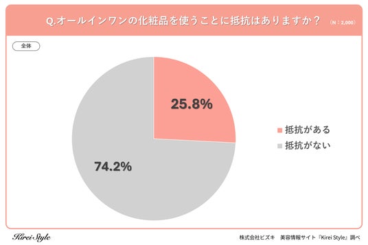 全国の20代~50代の女性1,000人を対象に、「オールインワンの化粧品を使うことに抵抗はありますか?」というアンケートを実施したところ、「抵抗がある」と回答した方は25.8%、「抵抗がない」方は74.2%となりました。