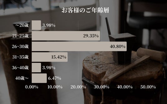 調査結果によると、顧客の中心層は「26~30歳」で全体の40.80%を占め、次いで「21~25歳」が29.35%と、20代が約70%を占めています。一方、「31~35歳」は15.42%、「36~40歳」と「~20歳」はそれぞれ3.98%、「40歳以上」は6.47%と低い割合です。