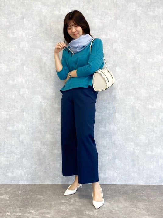 トップスと色をリンクさせた、体温調節に役立つストールアレンジ。シルク混の薄手ストールは、ぐるりと巻き付けてもボリュームが出すぎず、軽やかに首周りをカバーしてくれます。お出かけの際のコートインにもおすすめのスタイルです。