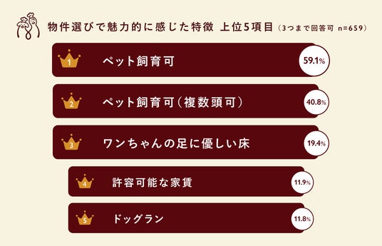 当社サービス「ココグルメ」のユーザー814名に現在お住まいの住宅に関するアンケート調査を実施。現住居の魅力的な点として「ペット飼育可」を挙げる人が59.1%、賃貸価格・購入価格が相場より高いと回答した人は27.8%でした。