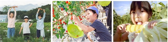 (体験メニュー例:ミニトマト収穫(7~10月)、とうもろこし(8月)、かぼちゃ(9月)、にんじん(10月)