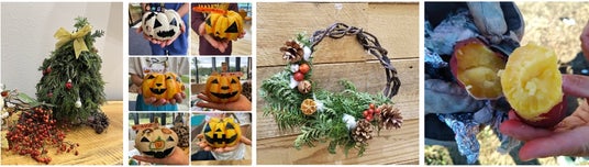 (例:ハロウィンかぼちゃデコレーション、サツマイモのつるで編んだクリスマスリース作り、焼き芋大会など)