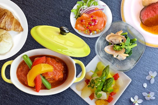 ホテルエミシア東京立川の最上階に位置する「スカイレストラン ハレアス」では、春の限定メニューをご用意いたしました。脂の乗ったスモークサーモンを爽やかなワサビドレッシングで味わうカルパッチョや、アサリと菜の花の旨みがギュッと詰まったからし和え、トマトの酸味が絶妙な若鶏のカチャトーラ、旬のアスパラガスを甘酸っぱいラビコットソースでいただく一品など、春らしい彩りの新作メニューが勢揃い。大切な人と過ごす特別な時間や、友人との食事会など、様々なシーンでご利用いただけます。