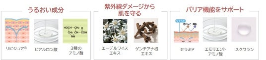 肌へのやさしさを考え、ウォータープルーフ処方なのにベビー用の洗浄料だけできれいに落とせる独自の技術「密着ヴェールミルク処方」を採用。肌を均一に覆い、紫外線を肌表面で効率よく散乱・反射させて紫外線の影響をしっかりガードします。この処方により、 ヨレや白浮きを抑え、うるおいと使用感がなめらかになりました。