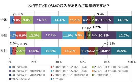 先の質問の回答において、「金額はこだわらないが、安定した収入がある」とありましたが、結婚するときにお相手や自分にどれくらいの年収があるのが理想的だと考えているのでしょうか。結婚する際、お相手や自分にどれくらいの収入・貯金があるのが理想的なのかについて聞きました。
