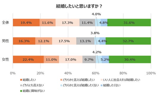 20~35歳の未婚男女2,413人を対象に、結婚の意思について聞いたところ、「結婚したい」と回答した人は19.4%でした。「どちらかと言えば結婚したい」人は11.6%、「いい人に出会えれば結婚したい」人は17.3%で、平成生まれの未婚男女全体の48.3%の人が結婚したいと考えていることが分かりました。