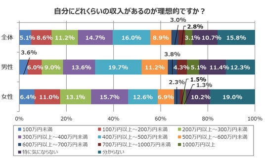 一方、自身の年収については、「400万円以上~500万円未満」(16.0%)が最も多く、次いで「300万円以上~400万円未満」(14.7%)、「200万円以上~300万円未満」(11.2%)となりました。なお、男性に関しては「400万円以上」が全体の4割以上を占めていました。