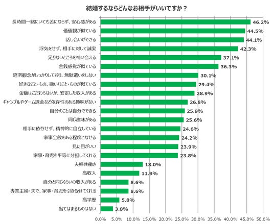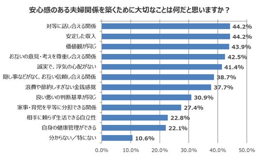 「対等に話し合える関係」(44.2%)と「安定した収入」(44.2%)が最も多く、次いで「価値観が同じ」(43.9%)、「お互いの意見・考えを尊重し合える関係」(42.5%)、「誠実で、浮気の心配がない」(41.4%)となりました。