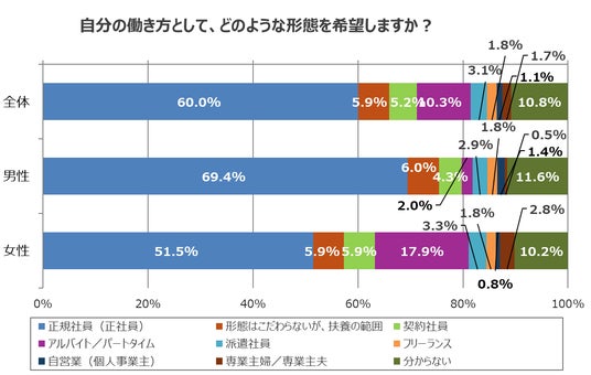 お相手の働き方としては「正規社員(正社員)」(68.6%)が最も多く、男性も半数以上の人がお相手にも正社員で働いてほしいと考えていることが分かりました。一方、自分の働き方については、「正規社員(正社員)」(60.0%)が最も多く、男性(69.4%)、女性(51.5%)となりました。