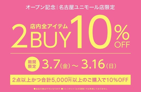「2BUY 10%OFFキャンペーン」をN+名古屋ユニモール店限定で、3月16日(日)まで開催!