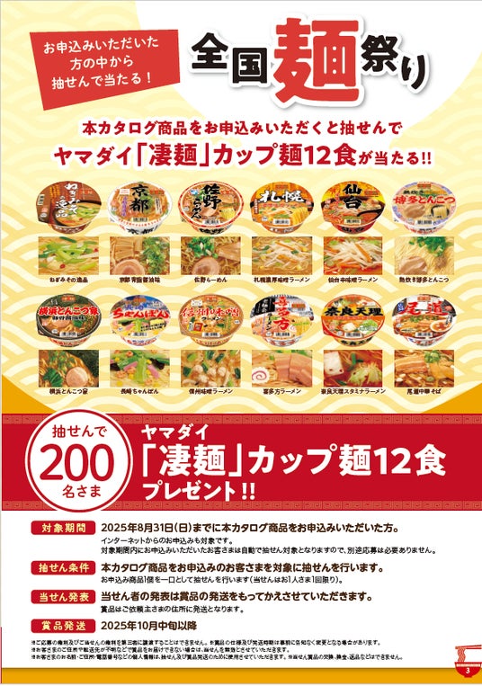 本カタログ商品をお申込みいただくと抽せんで「ヤマダイ『凄麺』カップ麺12食」が当たります。